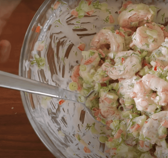 - Now, add the cooled shrimp to your salad and drizzle the dressing over everything. Gently toss it all together to mix.